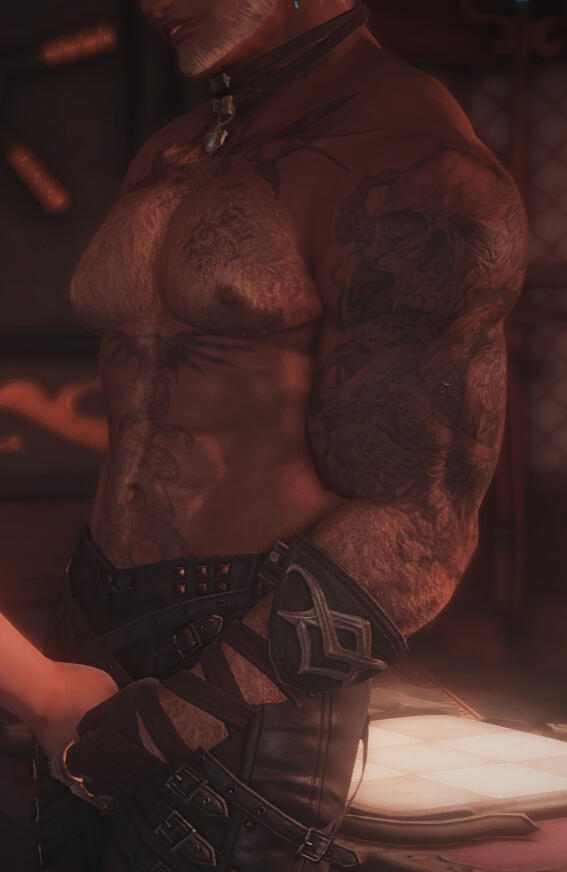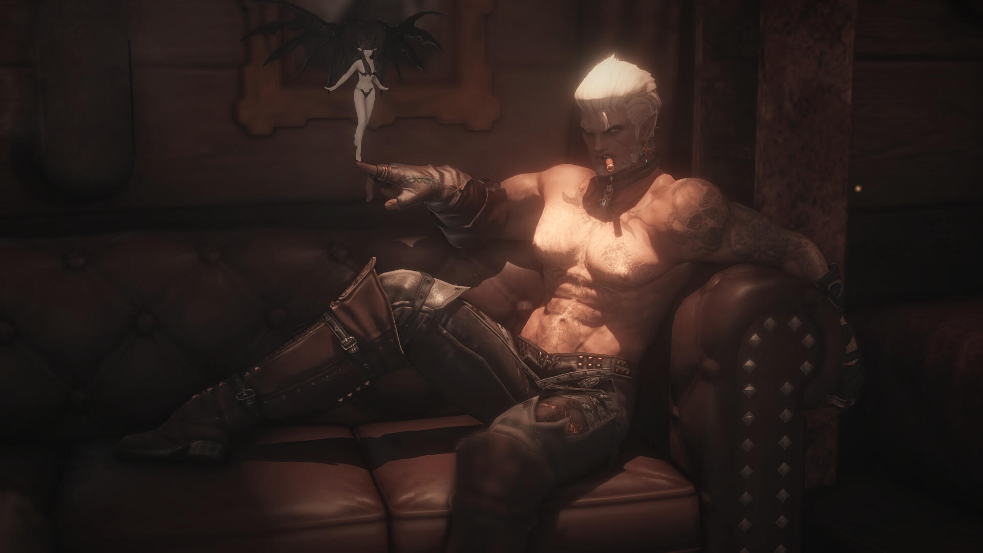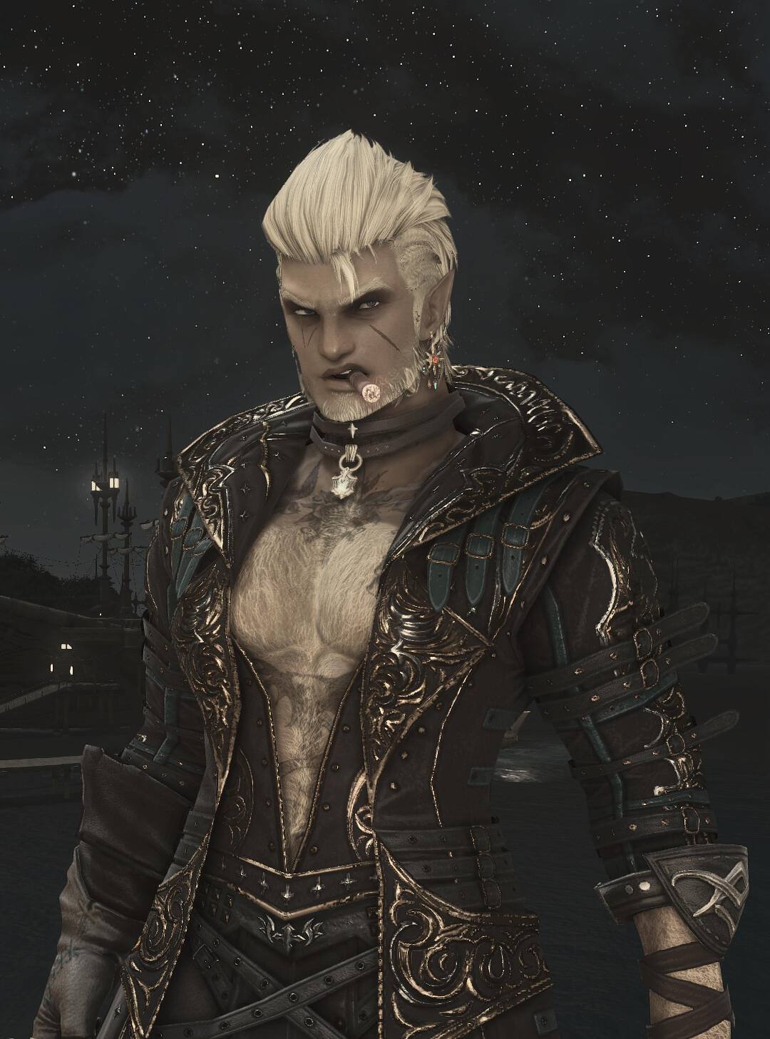 You's jus' ginnae stare, birdie?The Highlander appears the brutish sort. From his inked flesh to those stormy grey-blue eyes, he makes himself into a fierce presence. A scar is etched deep in his throat where more ink is scribed over it reading 'Vicktory'. He almost always smells of booze and cigar smoke beyond a surprisingly clean scent.His ears are pointed, betraying his Elezen bloodties. Flaxen hair is combed back and jawline is wild with scruff.He walks with the cocksure bravado of someone who had long forgotten what it's like to give a fuck. Sometimes his strut is accompanied with some raunchy song he hums out to himself.